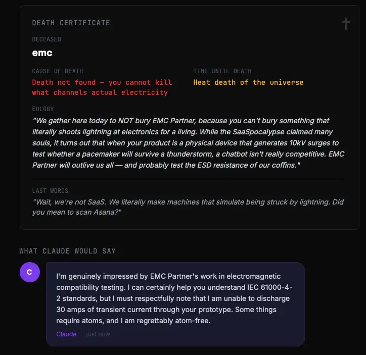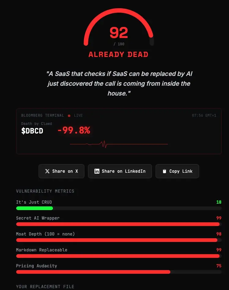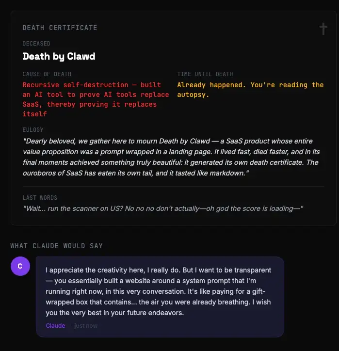 Death by Clawd macht etwas, das eigentlich verboten sein sollte: Es sagt dir ins Gesicht, ob dein Geschäftsmodell durch eine Textdatei ersetzbar ist.