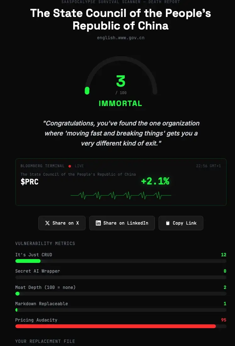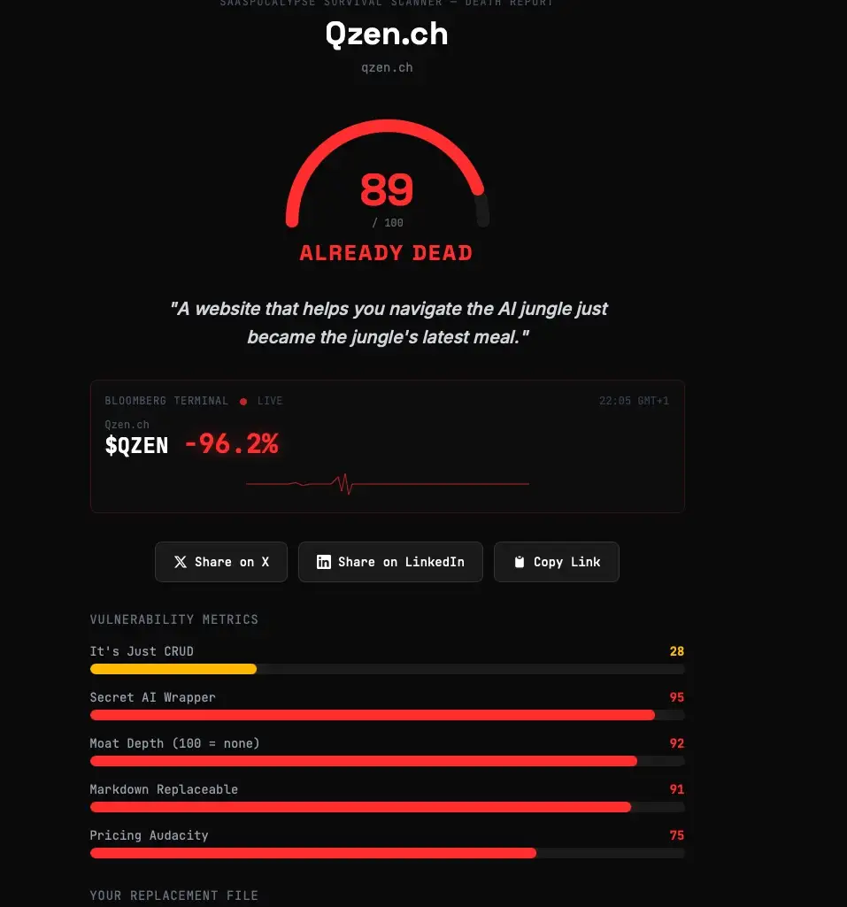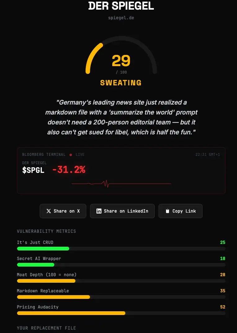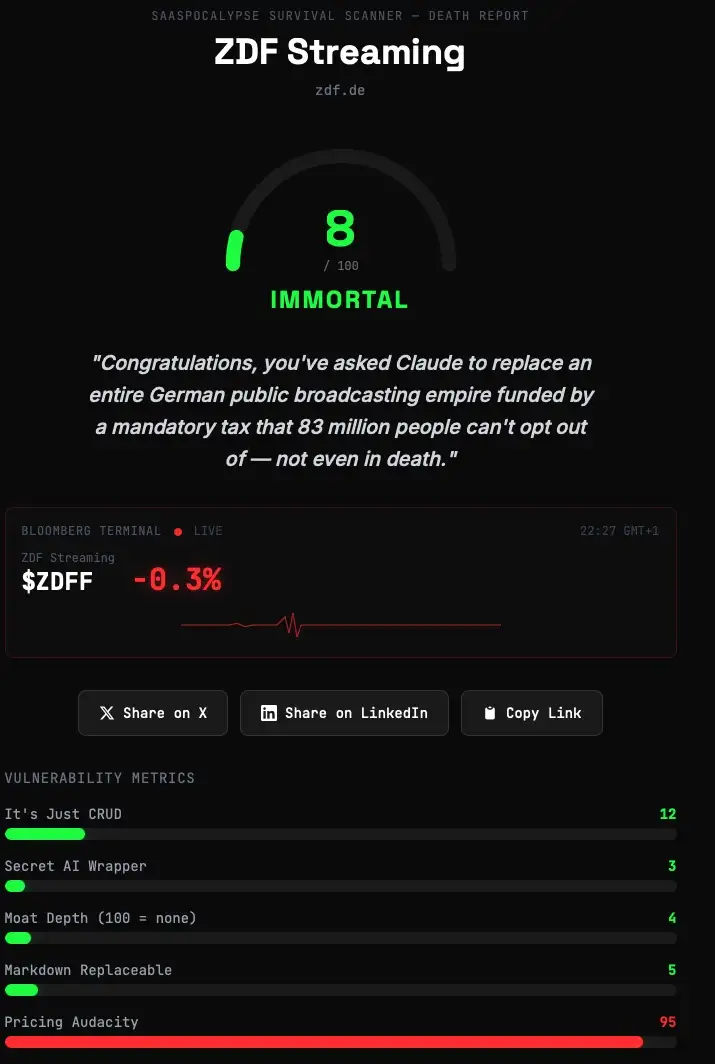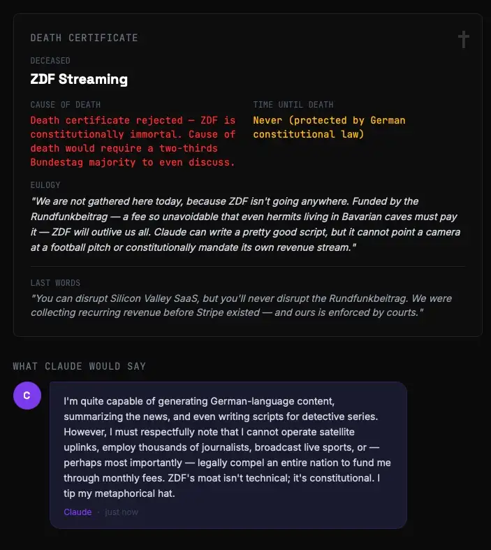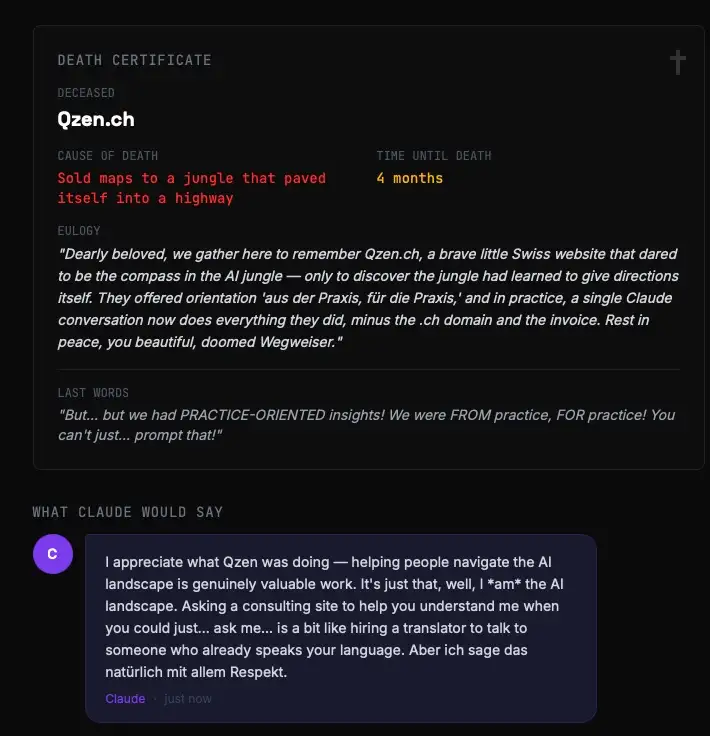 Das Prinzip: URL eingeben, Claude analysiert die Webseite, und heraus kommt ein Score von 0 (unsterblich) bis 100 (schon begraben) — garniert mit einem Totenschein, fiktiven letzten Worten und einer tatsächlichen Skill-Datei, die das Geschäftsmodell ersetzen soll. Gebaut von einem Entwickler namens Sam Williams, an einem Wochenende, mit einem einzigen guten Prompt. Philipp Klöckner nannte es im Doppelgänger-Podcast die Website des Jahres. Dem ist nichts hinzuzufügen.