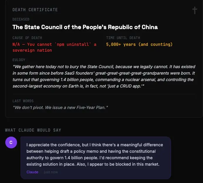 Nach ein paar weiteren Scans zeichnete sich die Formel ab. Je weiter weg von physischer Realität, Gesetzen und Infrastruktur, desto toter. Je näher an Atomen, Verfassungsrecht und Armeen, desto unsterblicher. Oder in der Sprache des Tools: You cannot npm uninstall a sovereign nation.