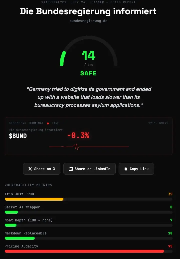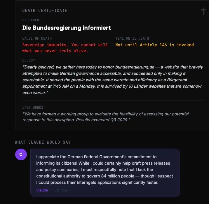 «You cannot kill what was never truly alive.» — bundesregierung.de in einem Satz. Die fiktiven letzten Worte sind allerdings die eigentliche Perle: Eine Arbeitsgruppe soll die Machbarkeit der Bewertung einer möglichen Reaktion auf die Disruption evaluieren. Ergebnisse Q3 2029. Wer deutsche Bürokratie kennt, weiß: Das ist kein Witz, das ist eine Prognose.